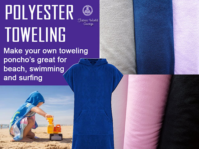 Make your own poncho’s with the selection of Polyester Toweling all 150cm wide available from our shop in George. Choose from different colours available in this soft toweling fabric. Toweling Poncho’s are great for beach, swimming and surfing. Visit our shop and choose your colours!
